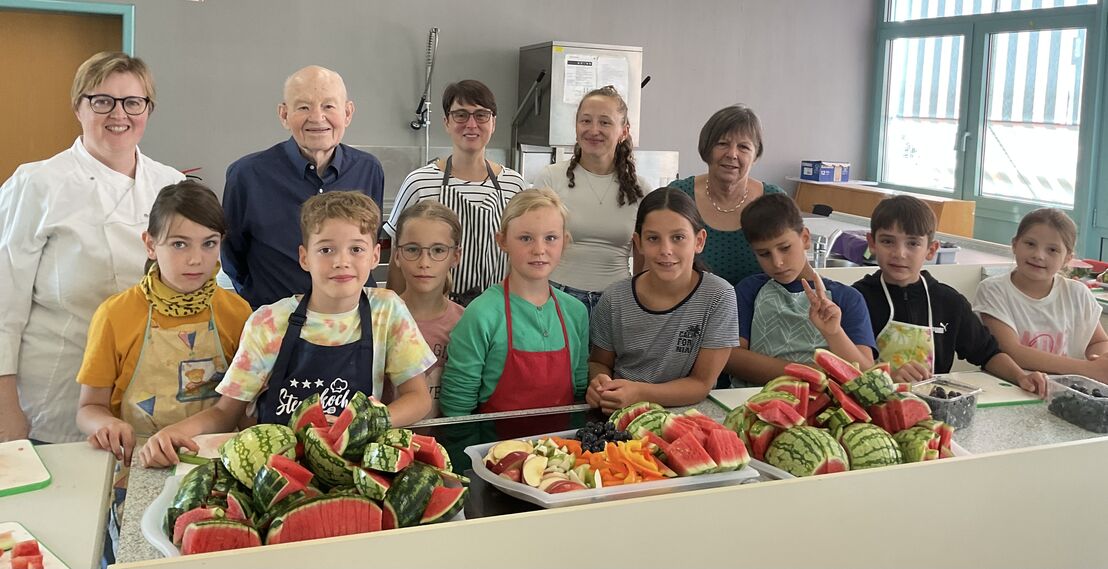 Mit gesunden Vitaminen in die Sommerferien - Schülerinnen und Schüler der Klasse 3b der Lußhardtschule bereiten leckere Vitaminteller für alle Klassen zu